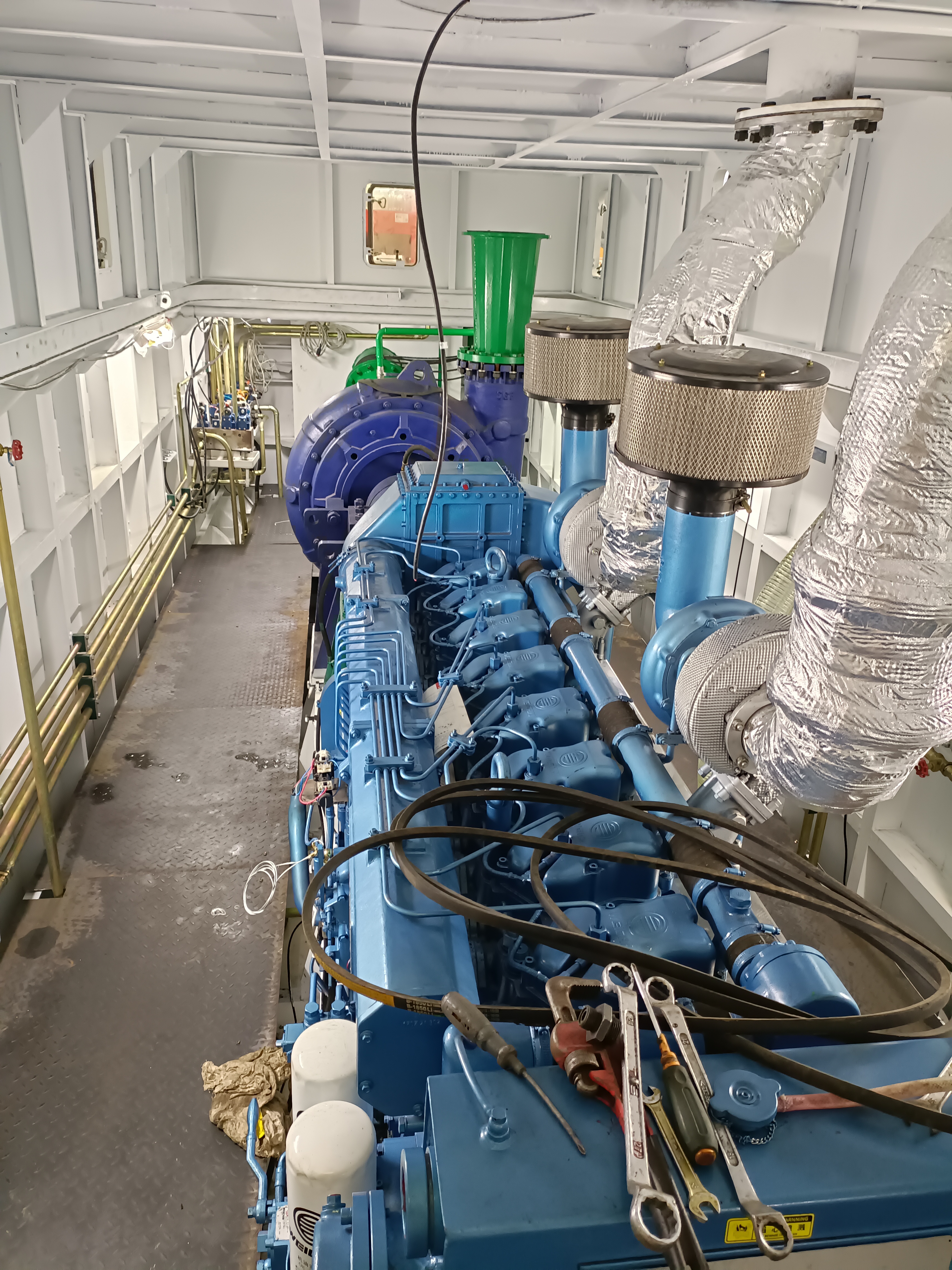 Dredging pump is driven by main diesel engine placed in main central pontoon, and auxiliary engine provides power to cutter head, winches, spuds and lighting system.